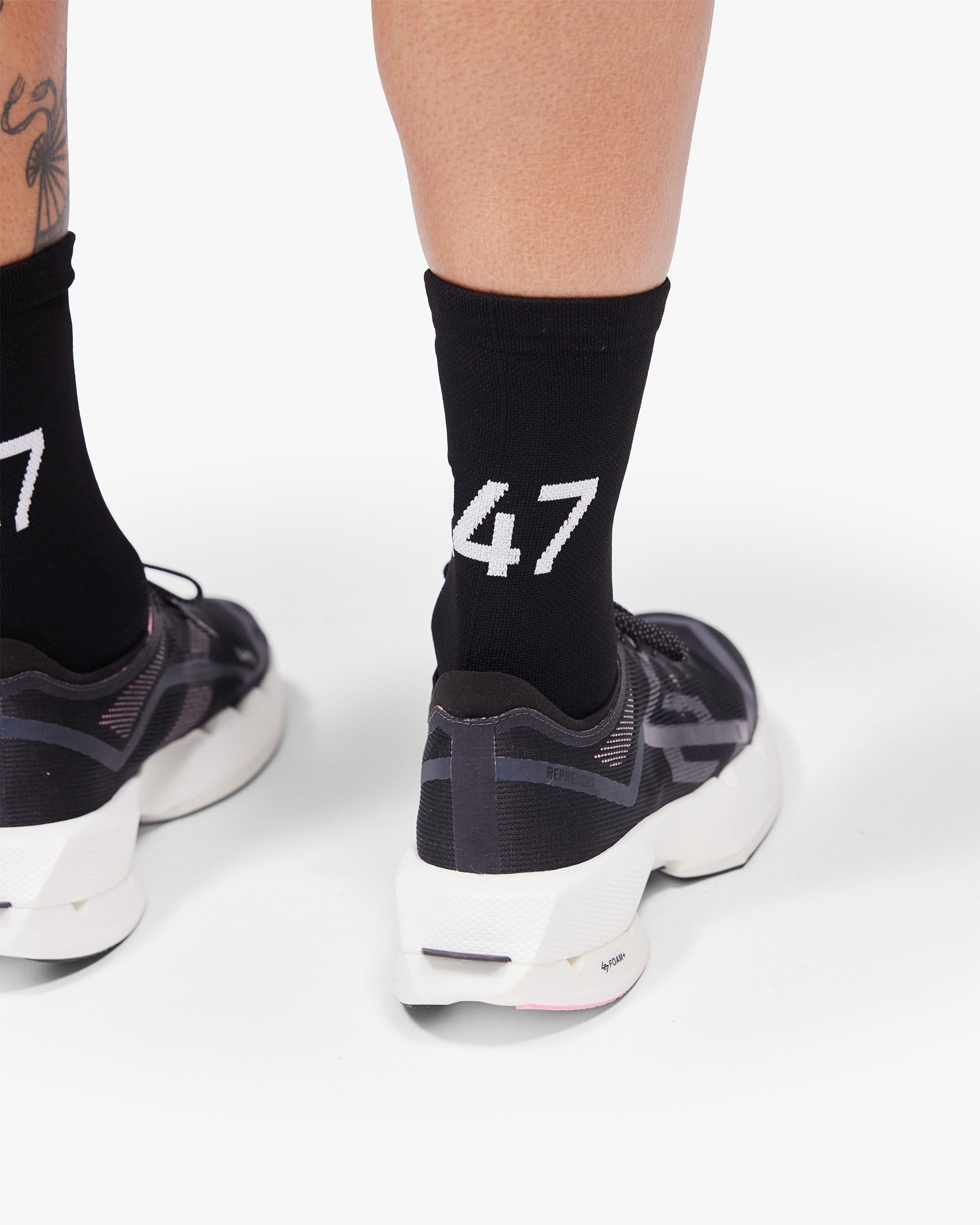 Introducing the 247 Numbers Sock in Jet Black. Engineered for hybrid training, built for athletes who train without compromise. A nylon race sock in a high stretch nylon blend with engineered knit structures for targeted arch and heel support. Finished with Represent branding to the toe, 247 lock-up to the back leg and On A Mission to the inner cuff. One size, 7-11.