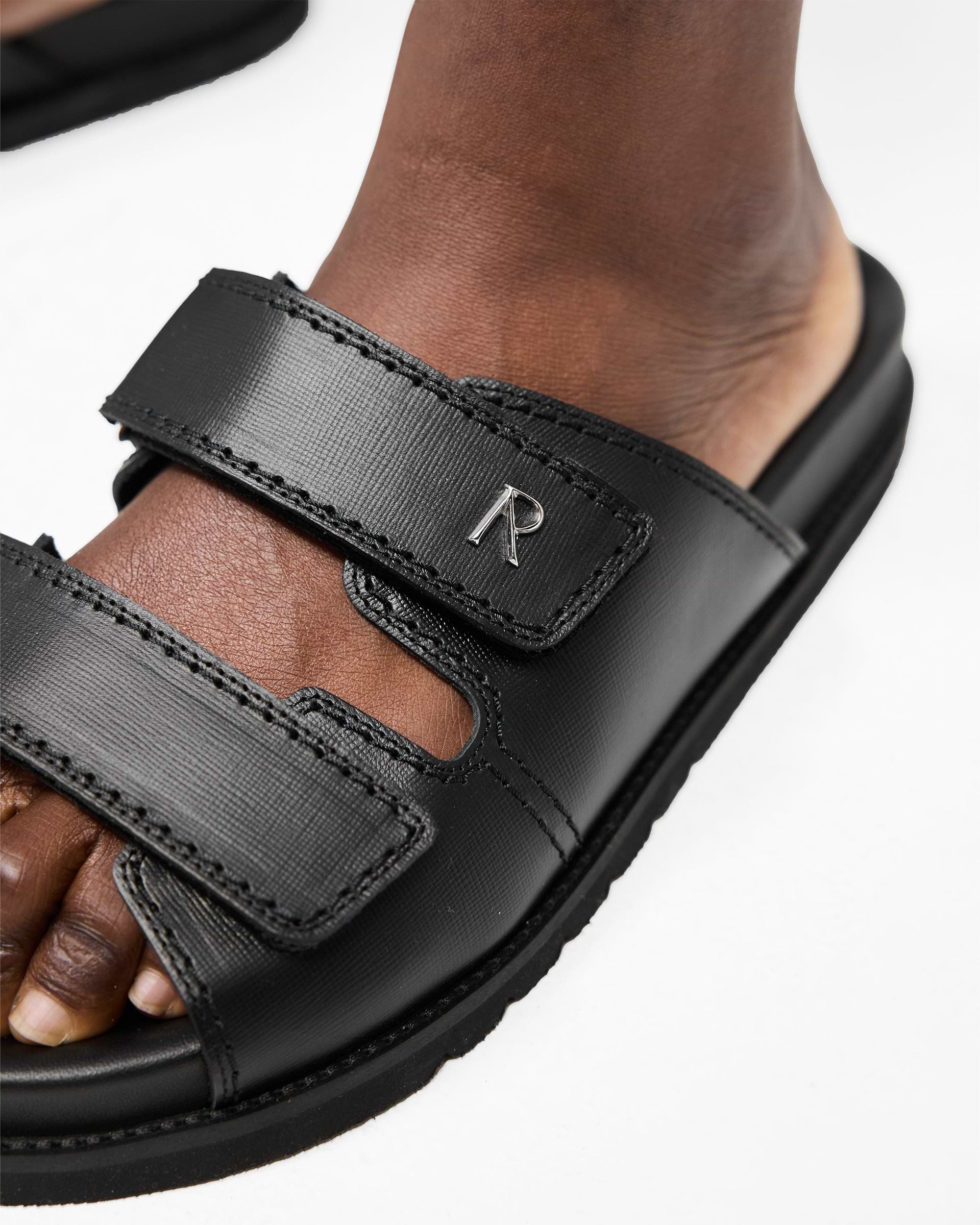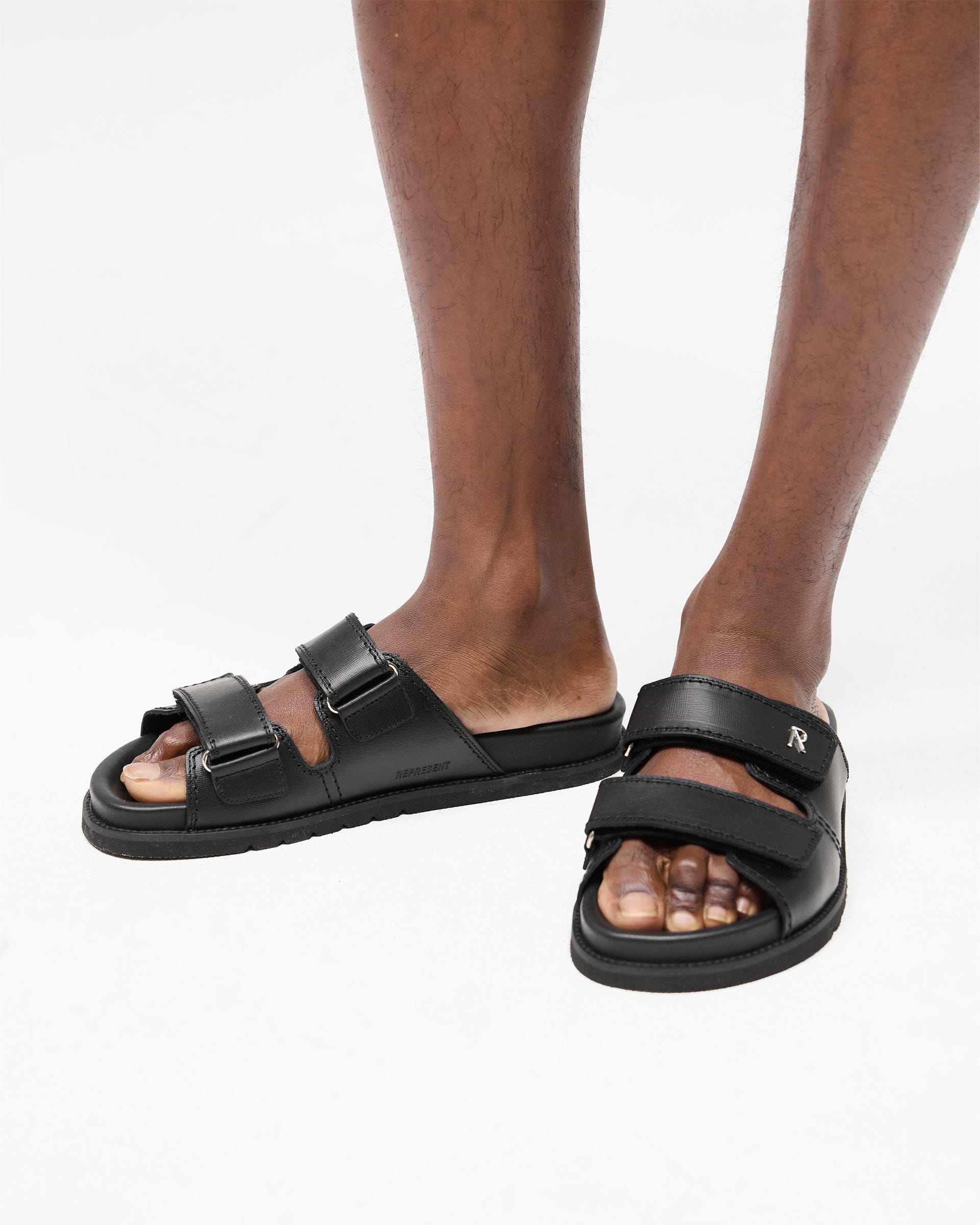 Introducing the Initial Sandal in Black, a premium slide built for comfort and clean styling. Constructed with a dual-strap upper and tonal velcro fastening, this sandal offers adjustable fit and easy wear. Finished with a soft contoured footbed and subtle Initial branding to the strap, it’s your go-to for laid-back summer days.