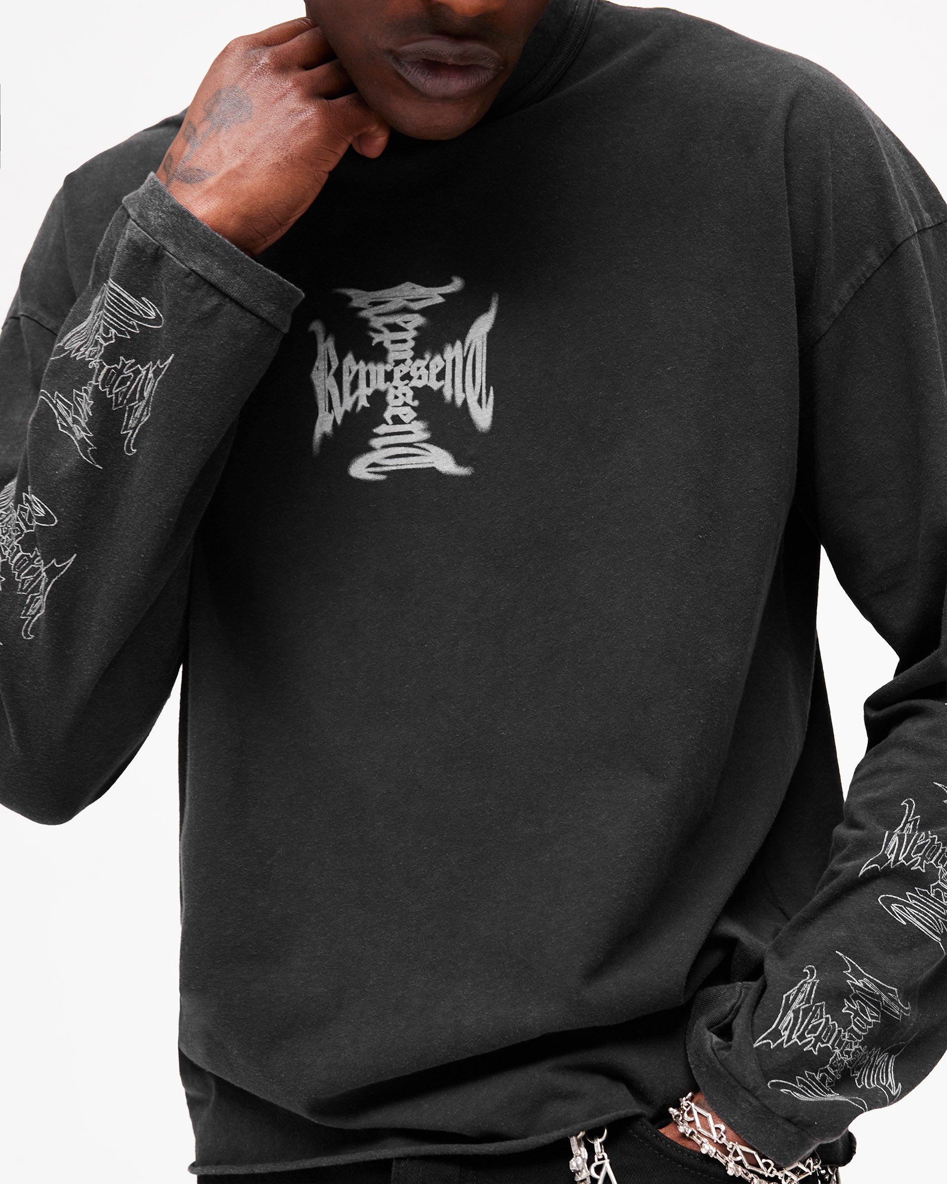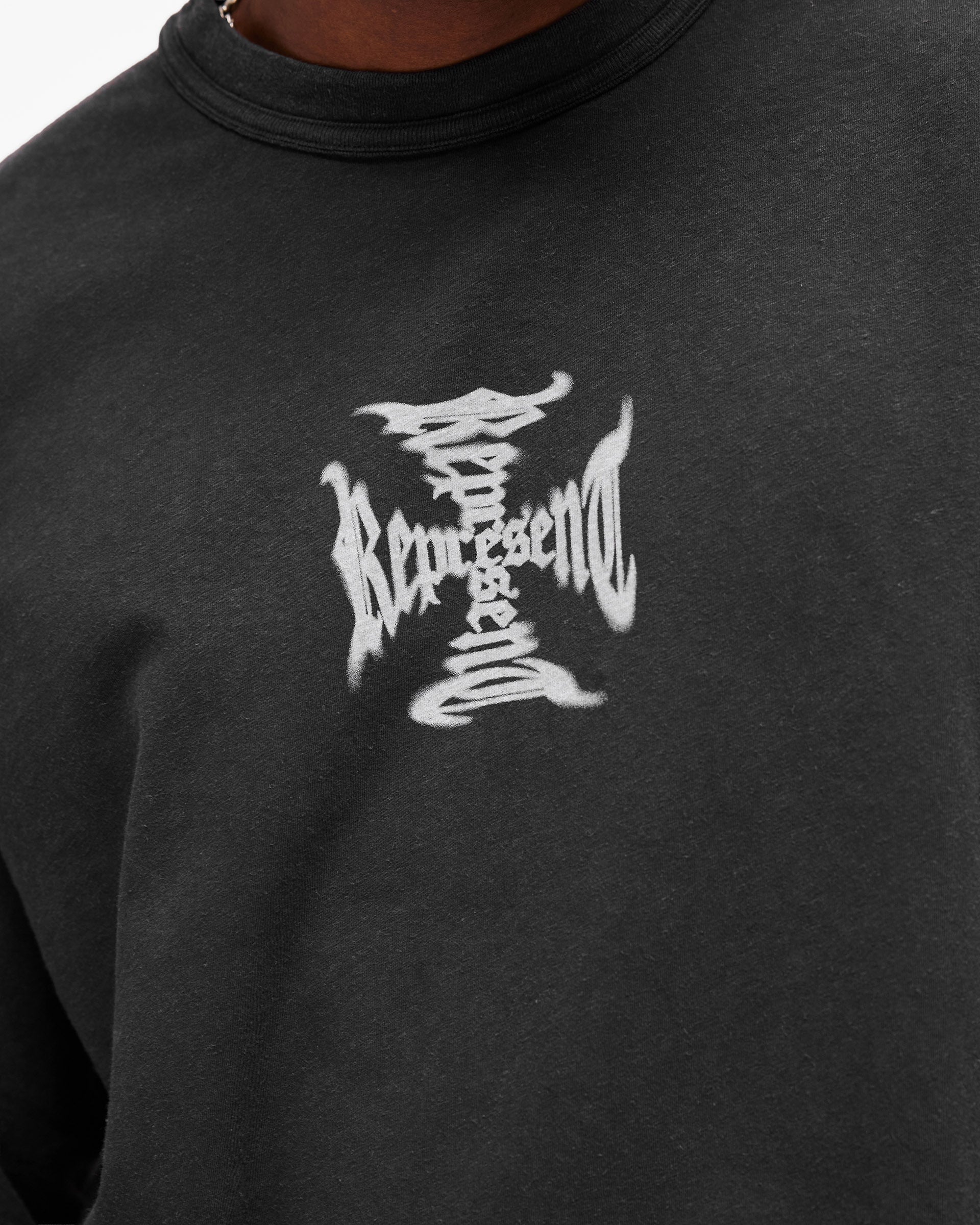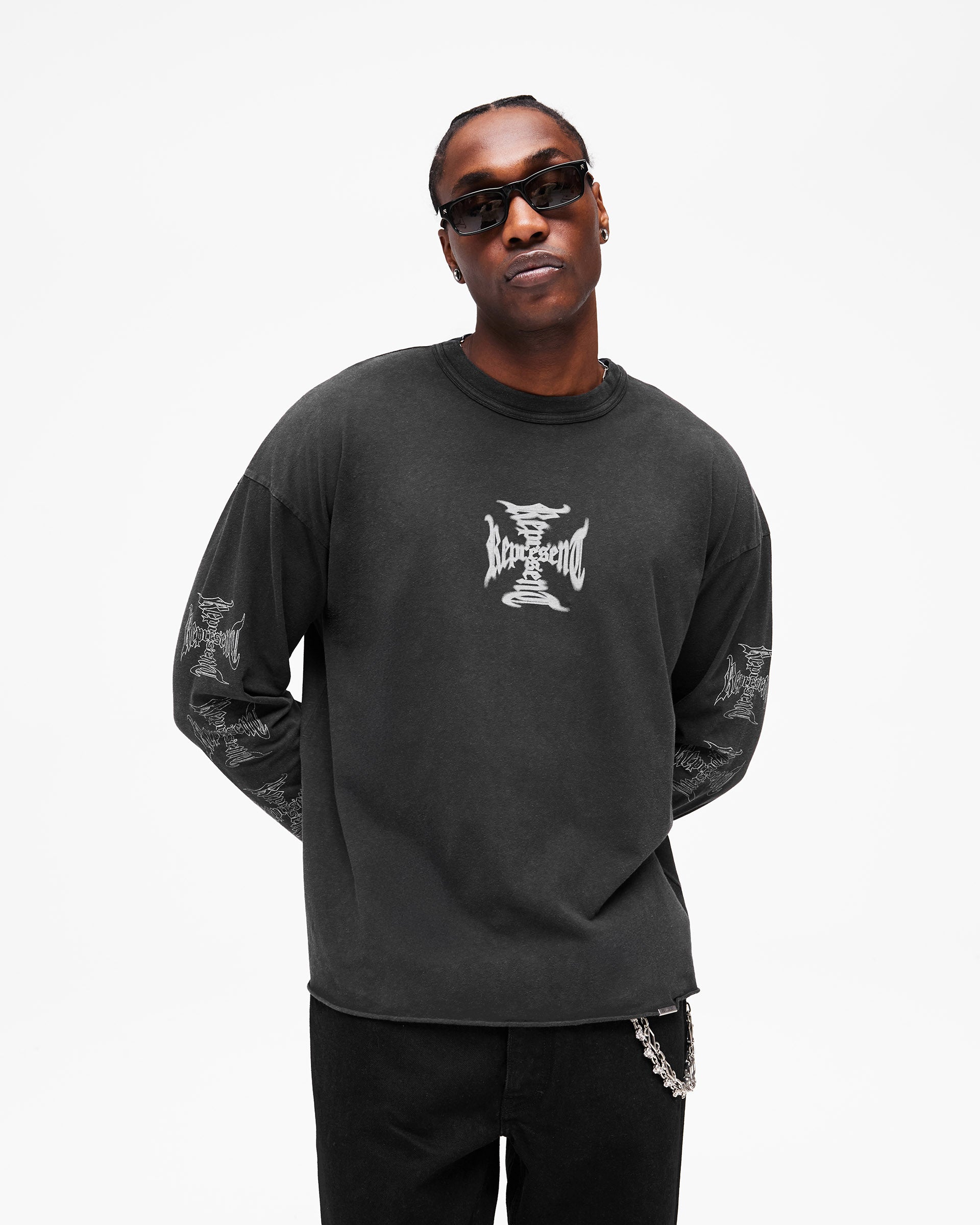 Featuring a Represent cross graphic in water-based ink to the centre front with a repeated cross motif running down both sleeves, finished with a rib collar, raw hem and our signature metal bar at the hem. Due to the unique wash and dye process used in production, each piece is one of a kind with intentional variations in colour, shading and finish.