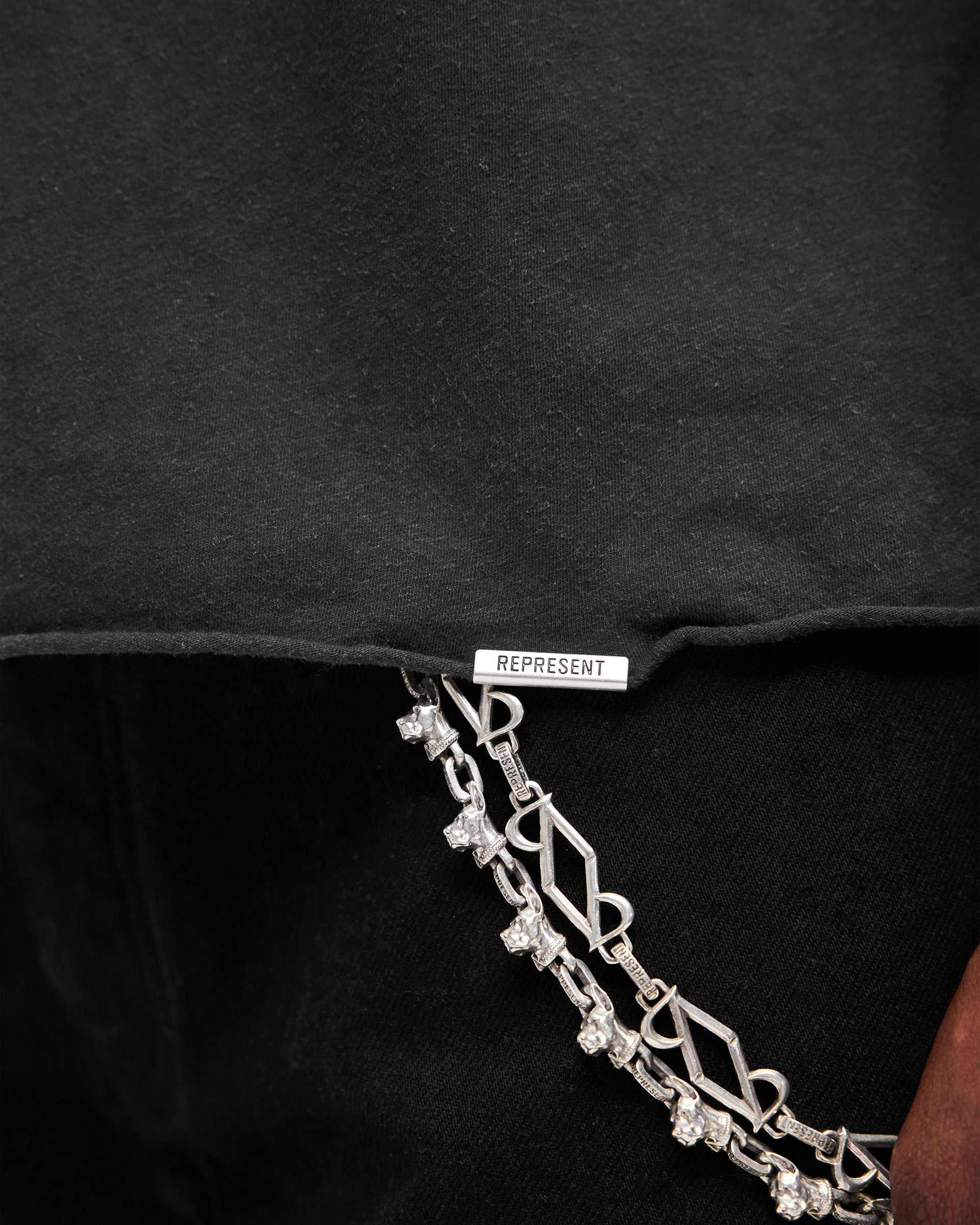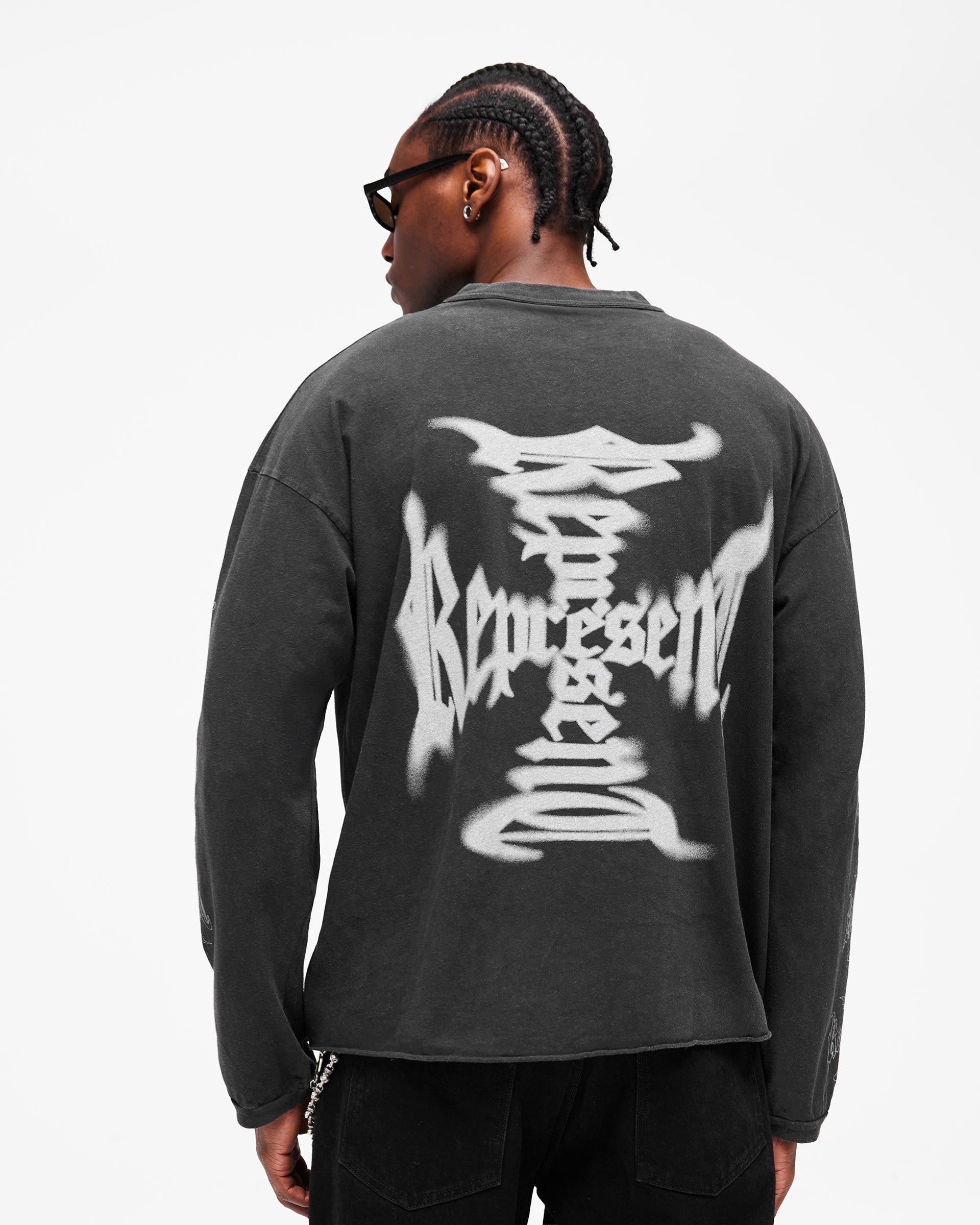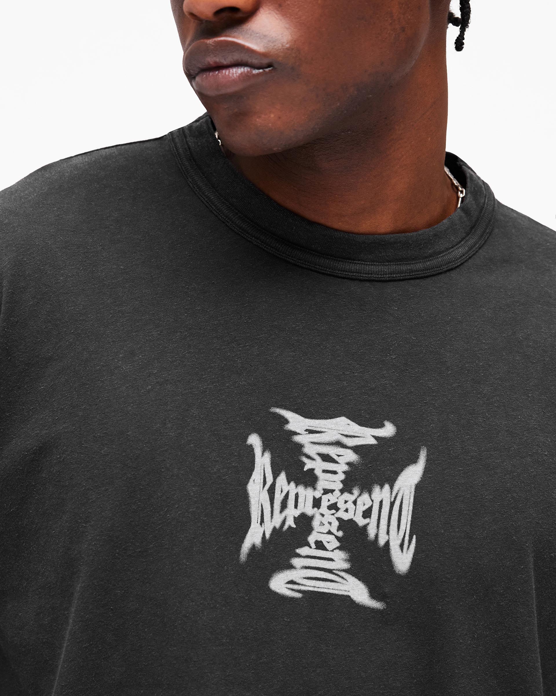 Featuring a Represent cross graphic in water-based ink to the centre front with a repeated cross motif running down both sleeves, finished with a rib collar, raw hem and our signature metal bar at the hem. Due to the unique wash and dye process used in production, each piece is one of a kind with intentional variations in colour, shading and finish.