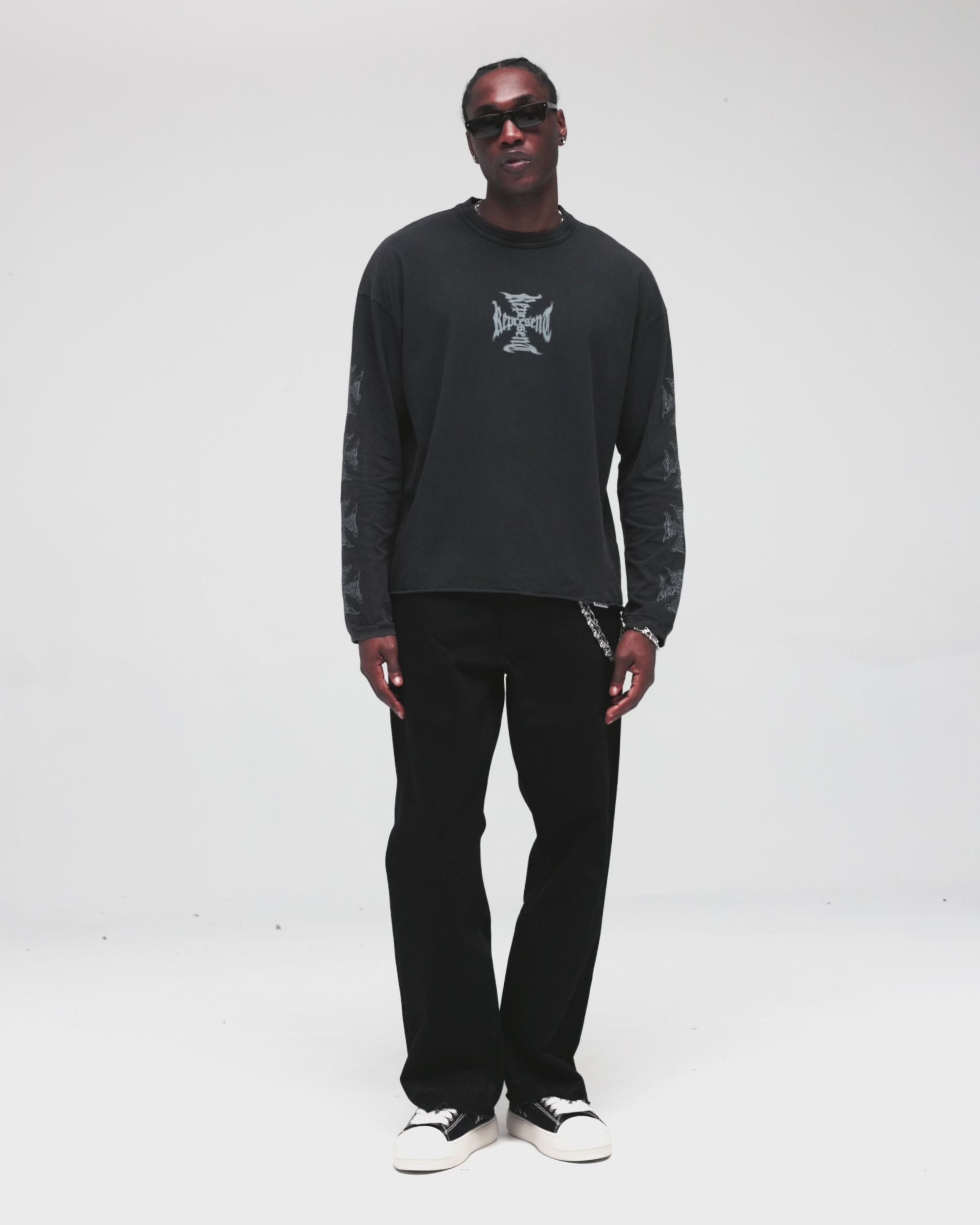Cotton Hemp Blend160gsm slub jersey with natural texture and vintage character.Centre Front GraphicRepresent cross in water-based ink that sits within the fabric.Sleeve PrintsRepeated cross motif running the length of both sleeves.Garment Dye ProcessFaded black finish that develops further character with every wash.