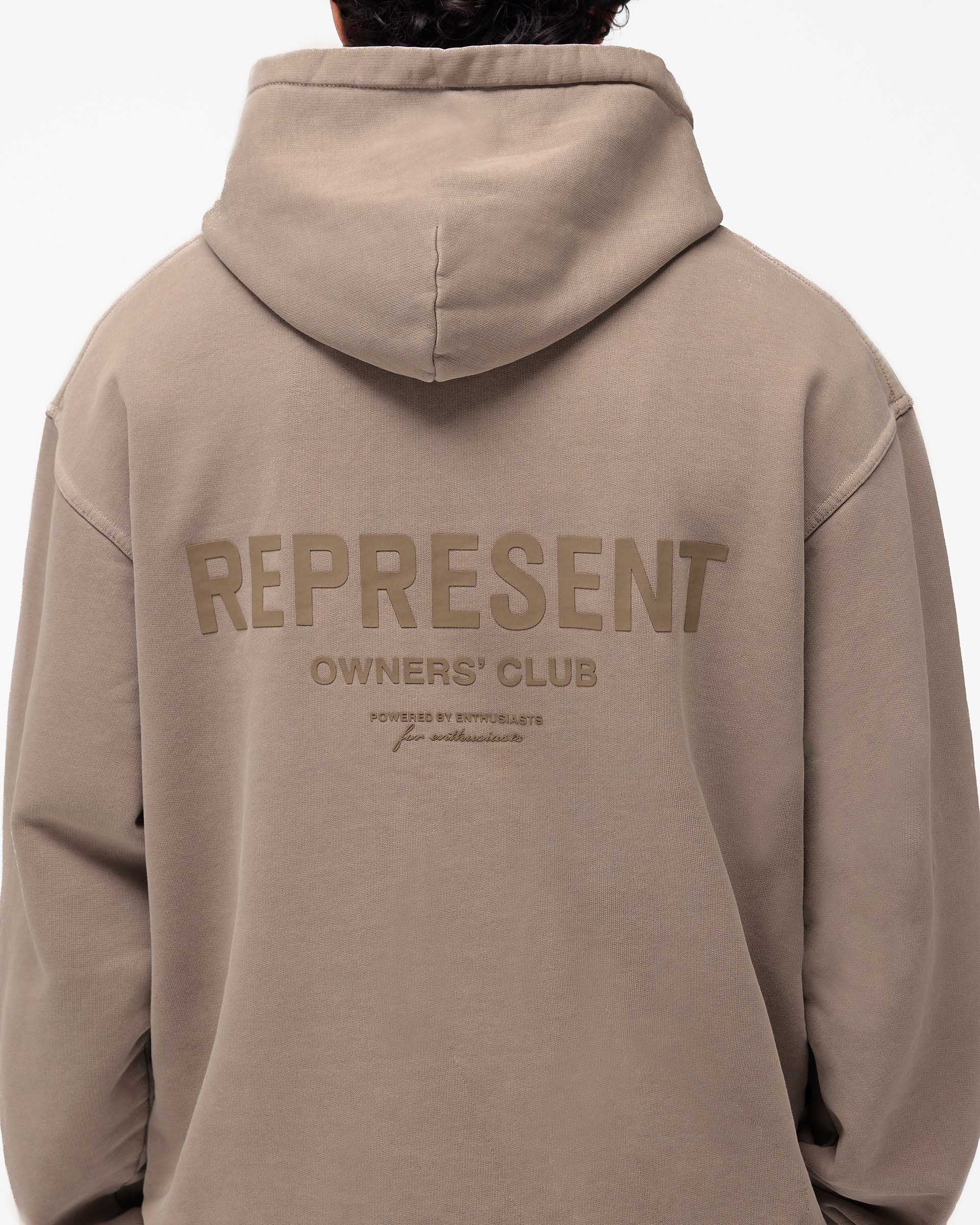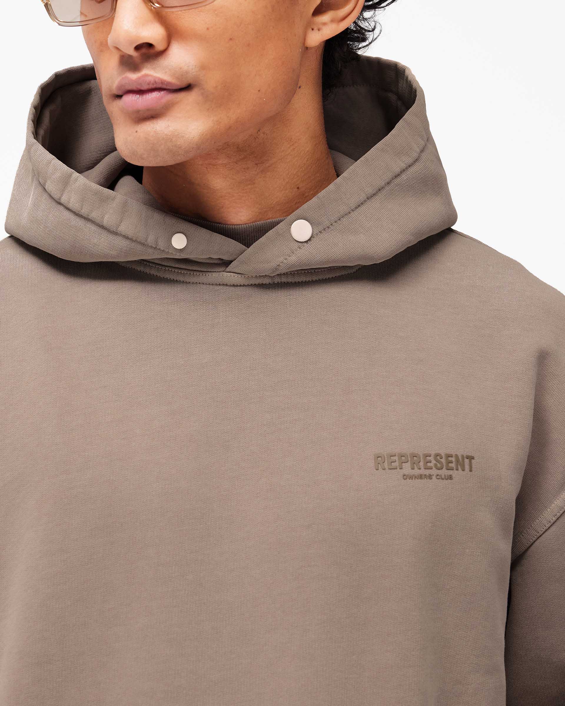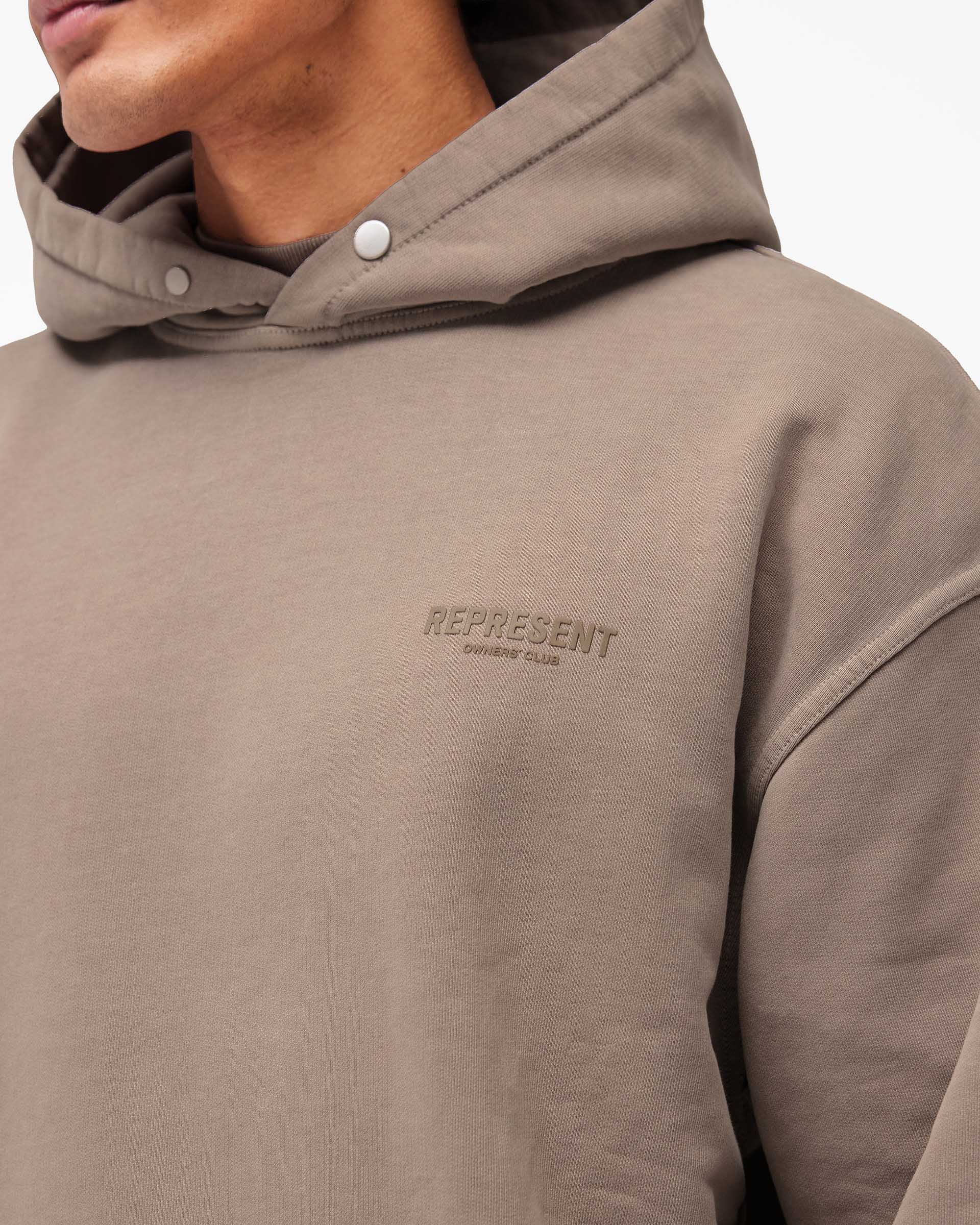 Introducing the Represent Owners Club Hoodie in Mushroom. Our most recognised piece, born in Manchester and worn worldwide. Cut from 480gsm heavyweight loopback cotton, piece dyed for depth of colour and pre-shrunk for a lived-in feel from the first wear. Owners Club branding sits to the chest and back, finished with a Cobrax popper hood, ribbed trims and our signature oversized fit that falls wide and square. Made in Portugal.
