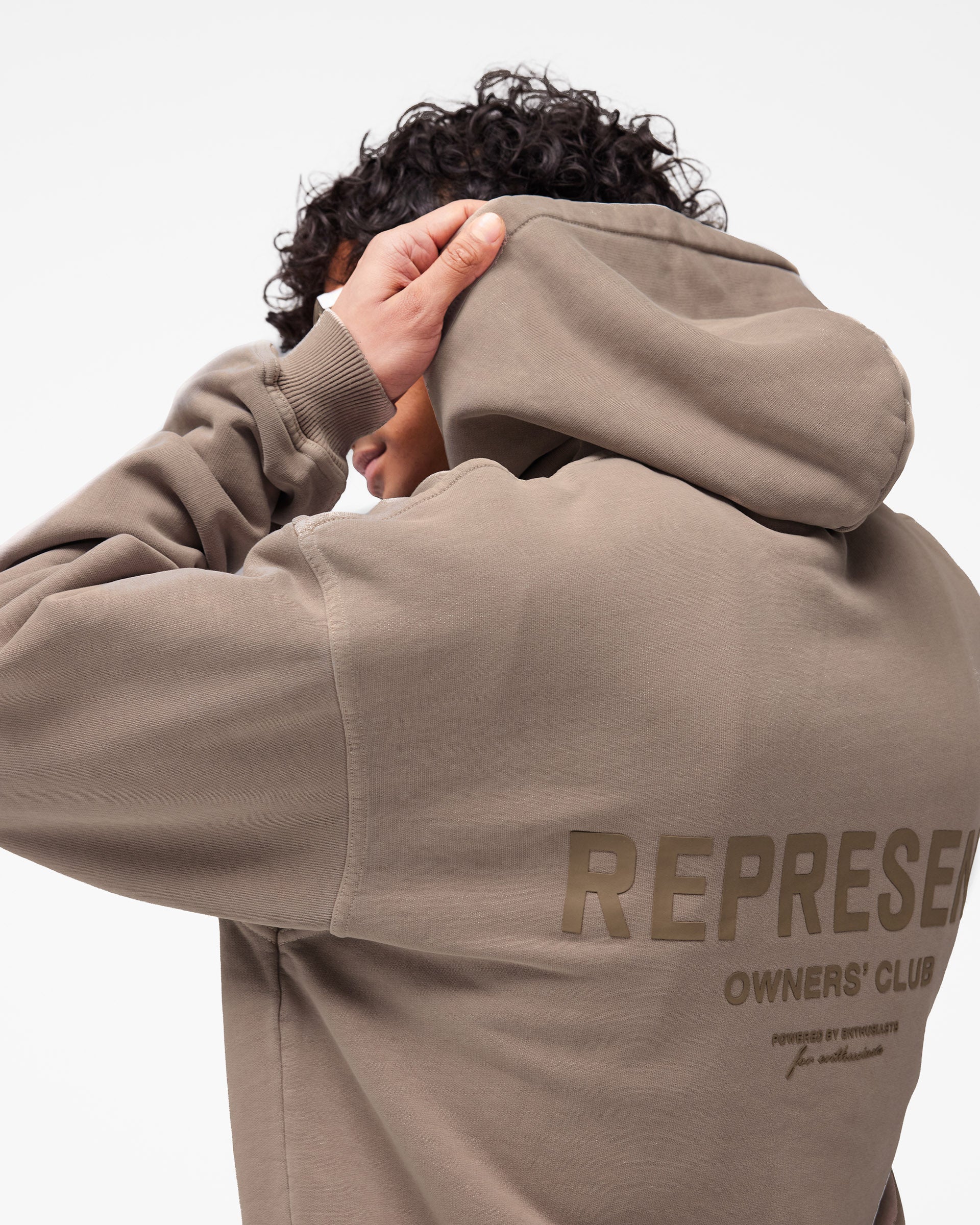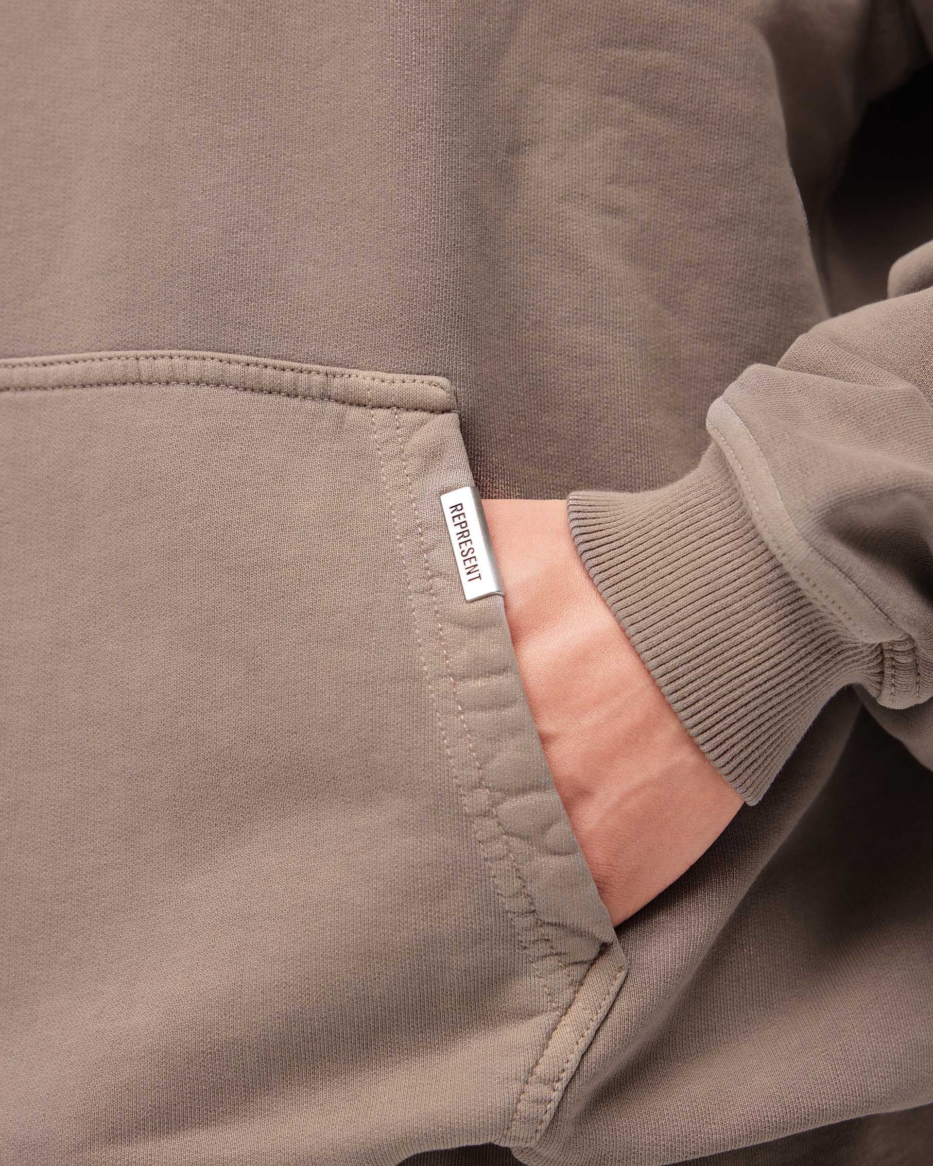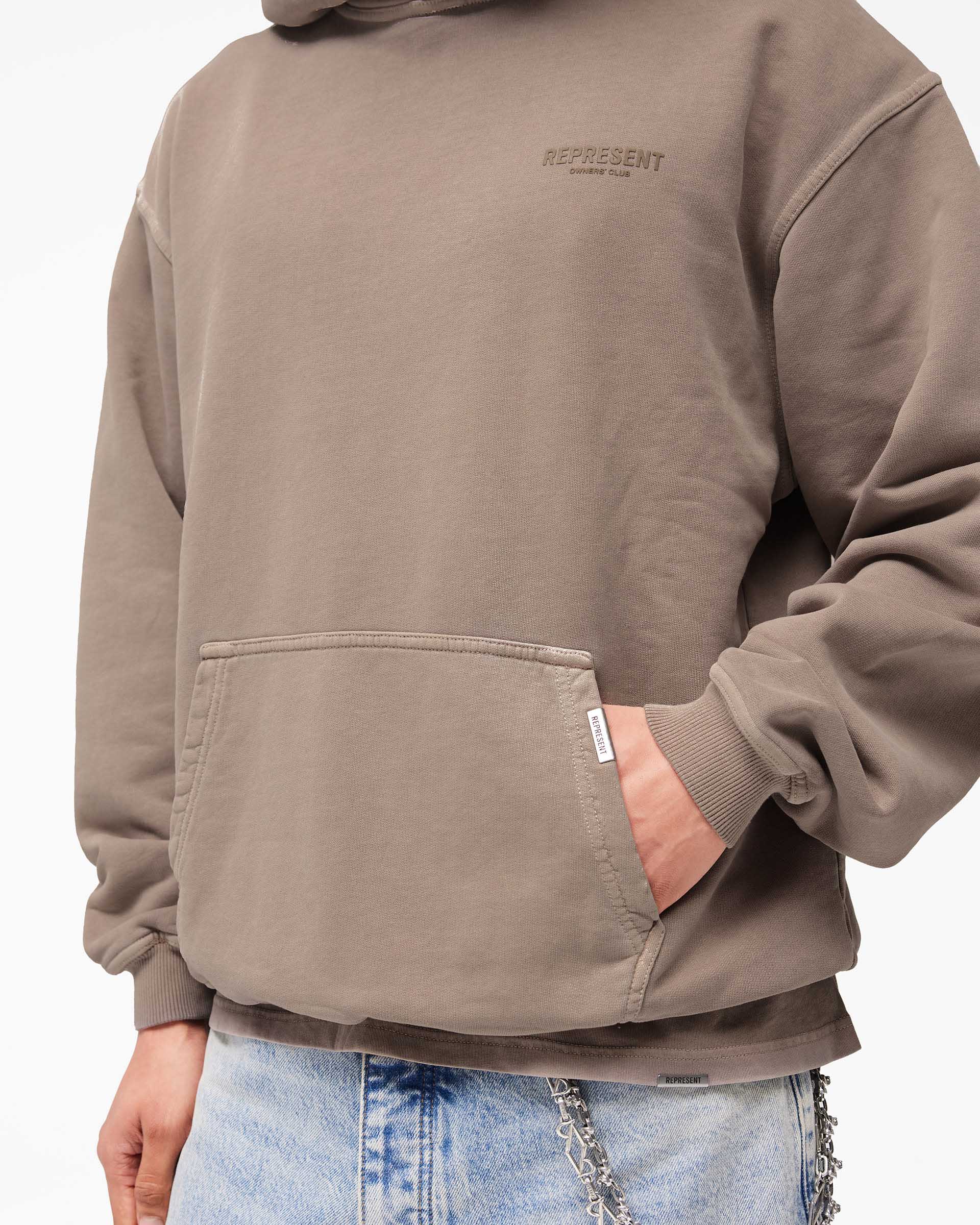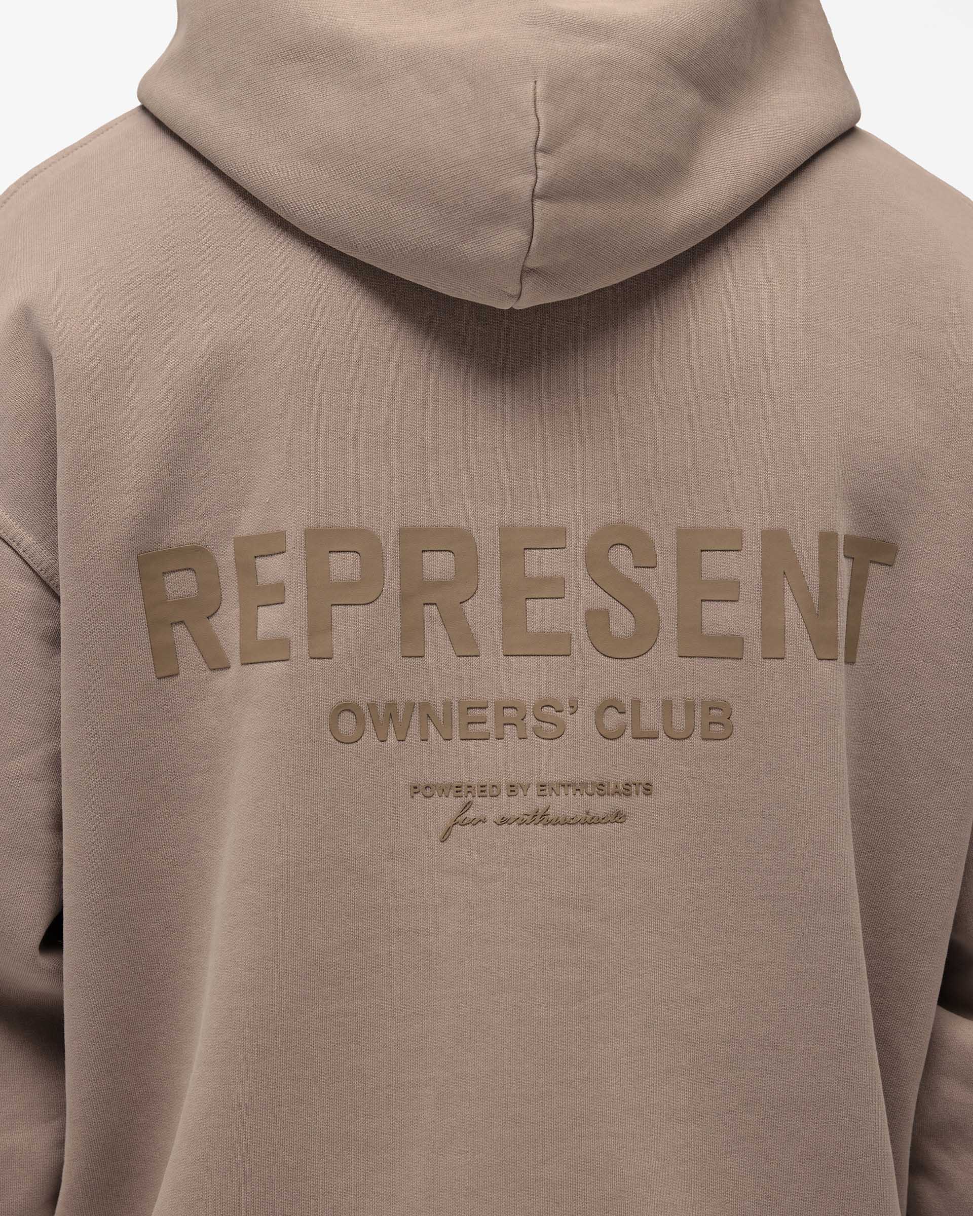 Introducing the Represent Owners Club Hoodie in Mushroom. Our most recognised piece, born in Manchester and worn worldwide. Cut from 480gsm heavyweight loopback cotton, piece dyed for depth of colour and pre-shrunk for a lived-in feel from the first wear. Owners Club branding sits to the chest and back, finished with a Cobrax popper hood, ribbed trims and our signature oversized fit that falls wide and square. Made in Portugal.