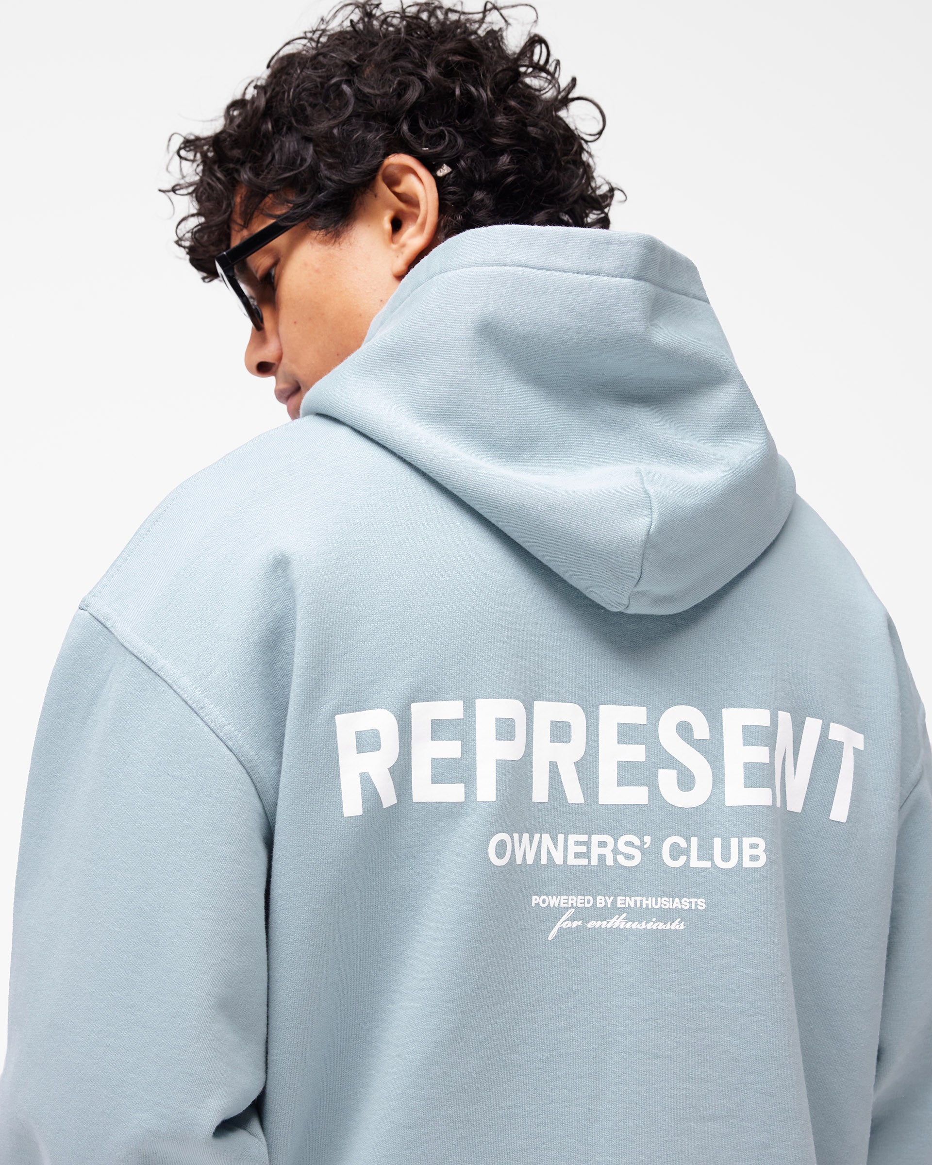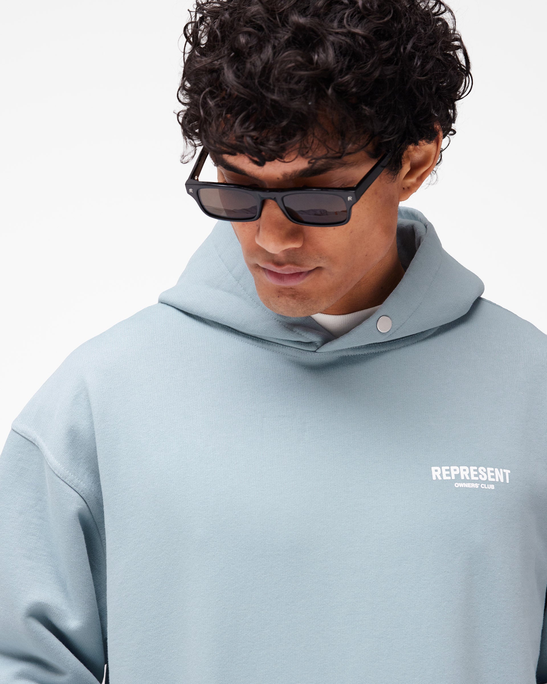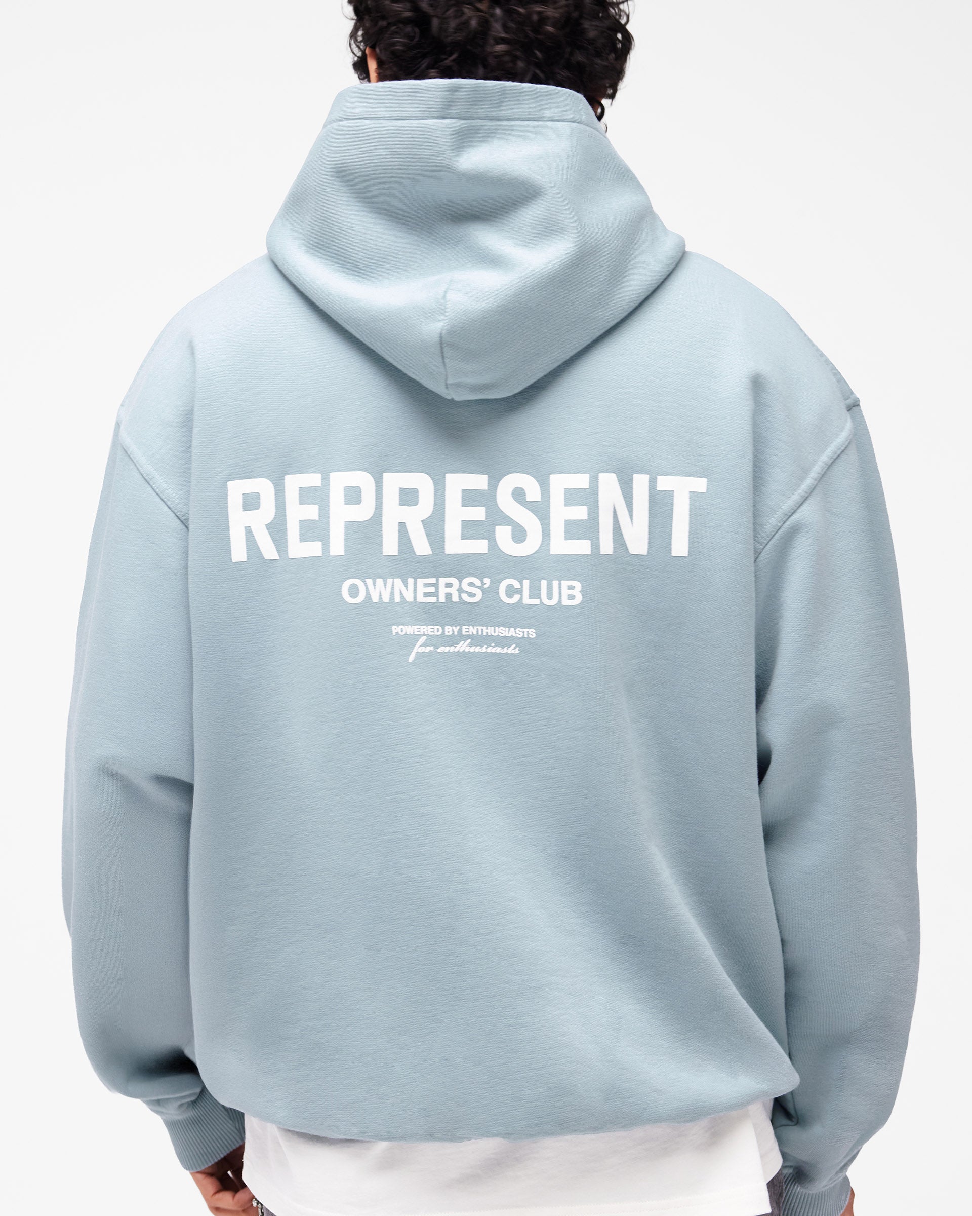 Introducing the Represent Owners Club Hoodie in Powder Blue. Our most recognised piece, born in Manchester and worn worldwide. Cut from 480gsm heavyweight loopback cotton, piece dyed for depth of colour and pre-shrunk for a lived-in feel from the first wear. Owners Club branding sits to the chest and back, finished with a Cobrax popper hood, ribbed trims and our signature oversized fit that falls wide and square. Made in Portugal.