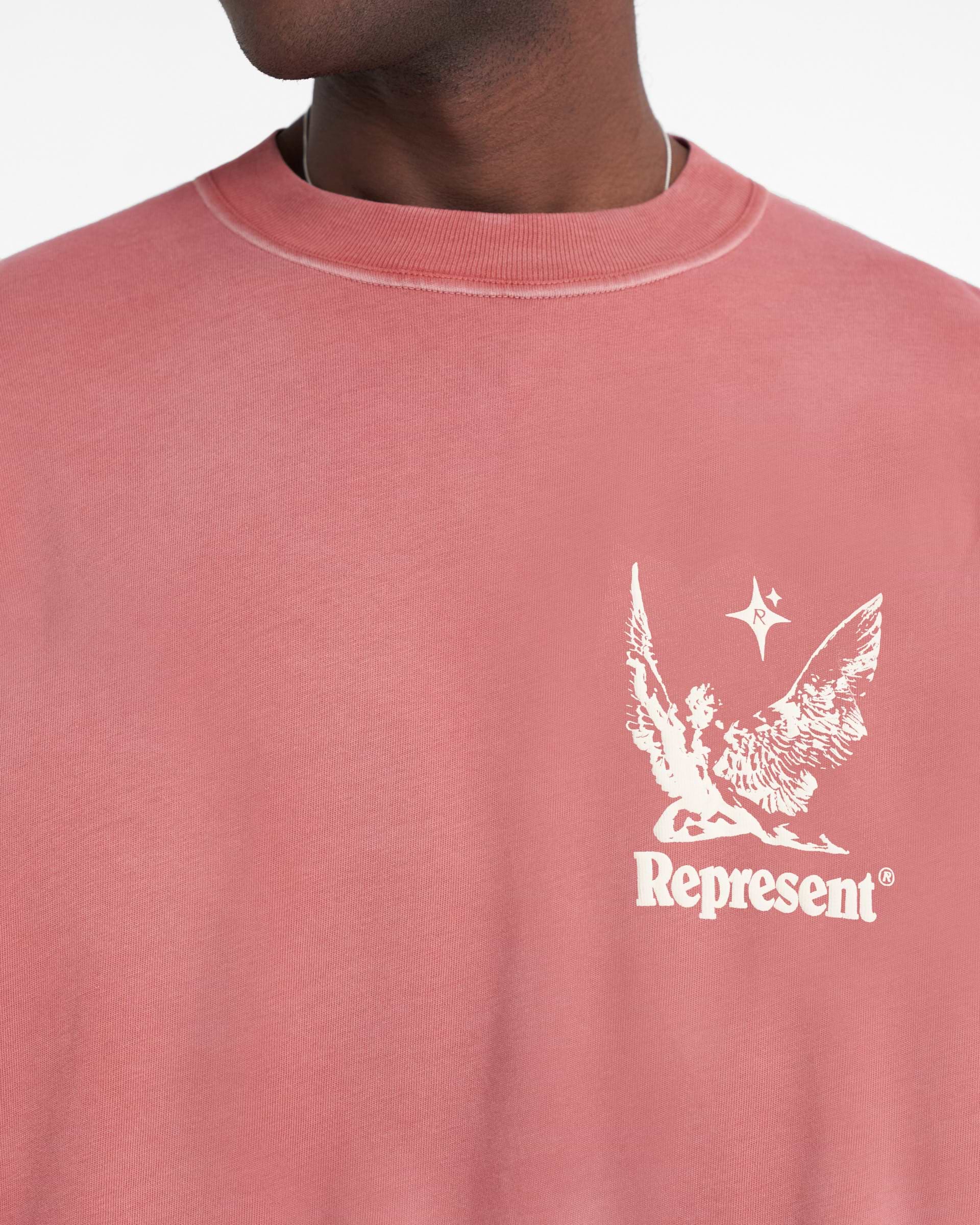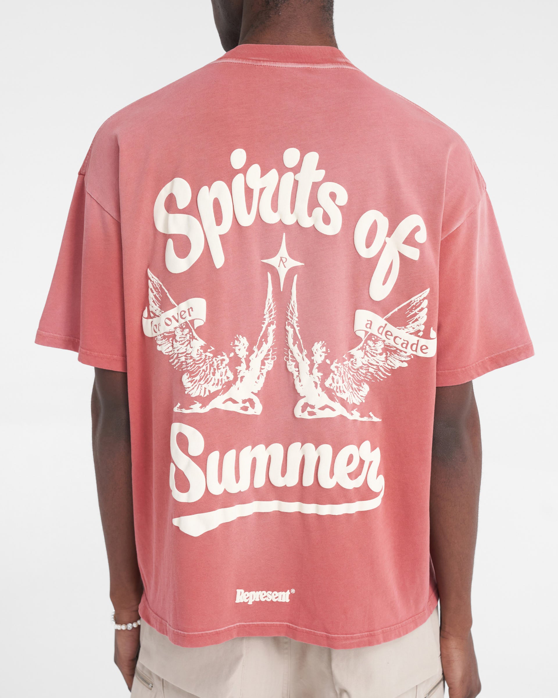 Introducing the Spirits of Summer T-Shirt in Sunrise, a luxury cotton t-shirt with a slightly oversized fit. This t-shirt is crafted with a pigment dye and spray technique, creating a gradient wash, making each piece truly unique. The t-shirt is finished with our Spirits of Summer puff print graphic to the front and back, and a Represent metal bar to the hem.